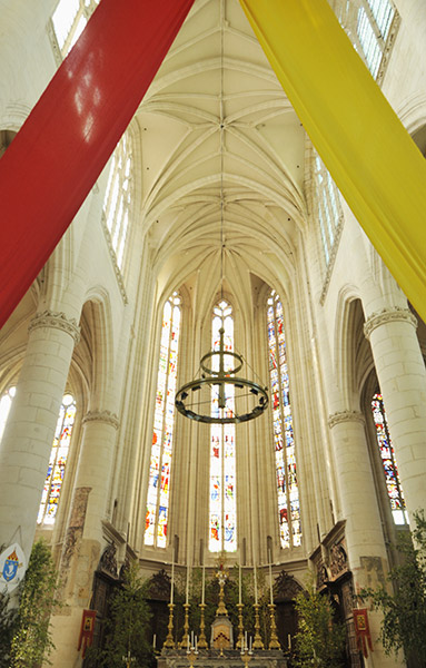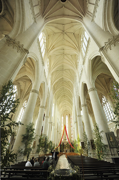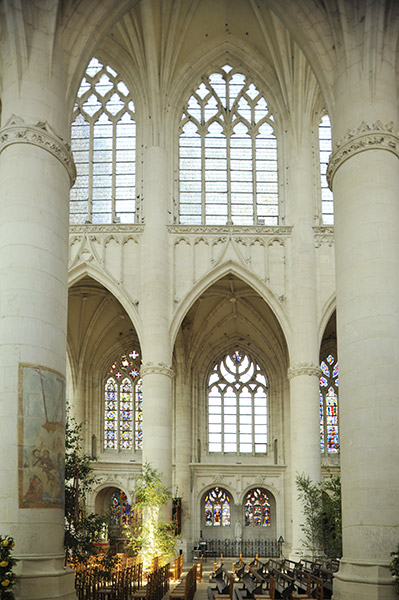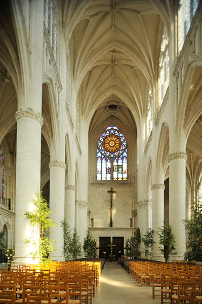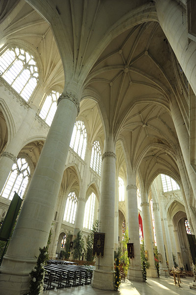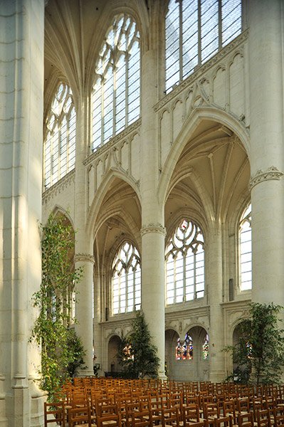 内部に入ると明るさに驚く。トリビューンが無く大アーケードと高窓の二層構成で柱は細く窓は大きく繊細な印象である。身廊はプランのように途中で屈曲している |