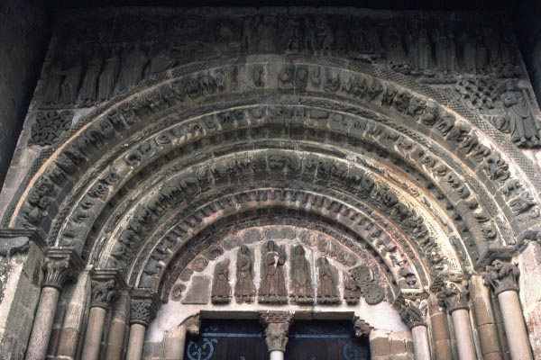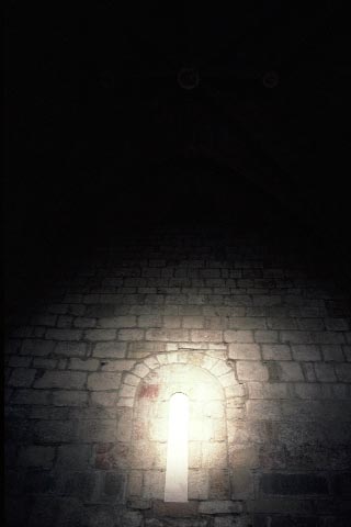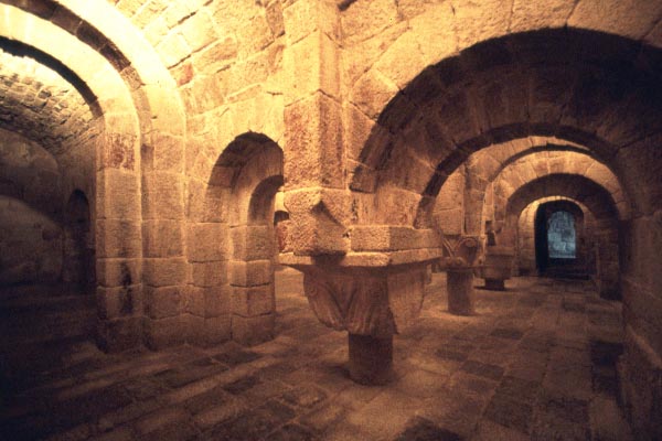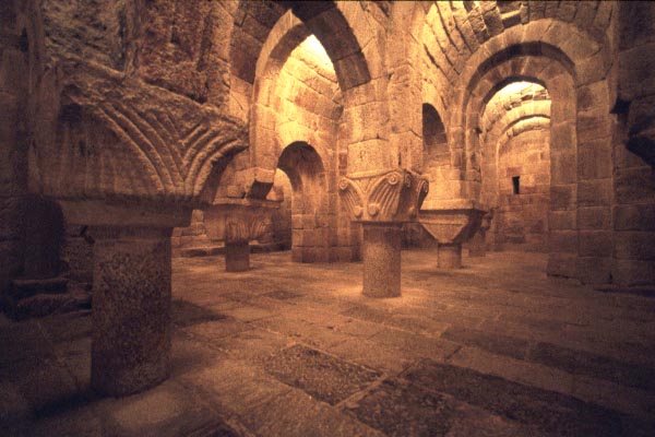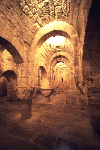 スペイン バスク地方 レイレ山脈の山ふところ、標高750mにロマネスク様式の修道院は建っている。12月の末、友人達とイエサ(Yesa)のダム湖を見下ろす門前に立つと突然の霰に見舞われた。 ナヴァラ王国の信仰の中心としてサン・サルバドル・デ・レイレ大修道院は1057年に献堂された。有名なクリプト(地下祭室)は他では見たことのない空間、ところどころ二重になっているボールトを支える大きな柱頭はそれぞれにデザインが違い、その下の短い細い柱は長さがまちまちである。もっとずっと背の高い空間が洪水で埋まったような印象を持った。