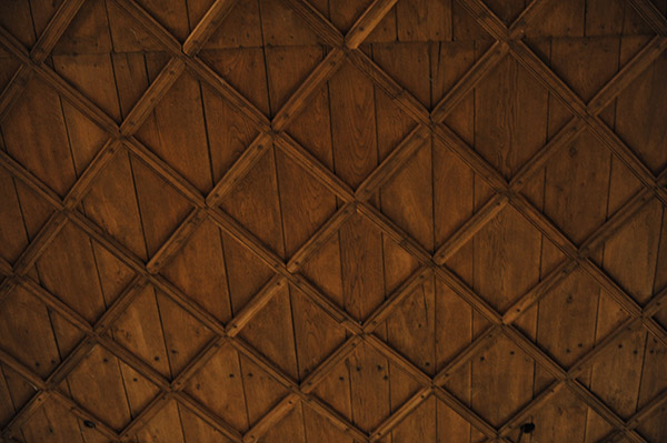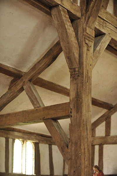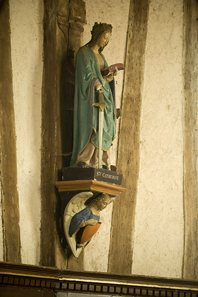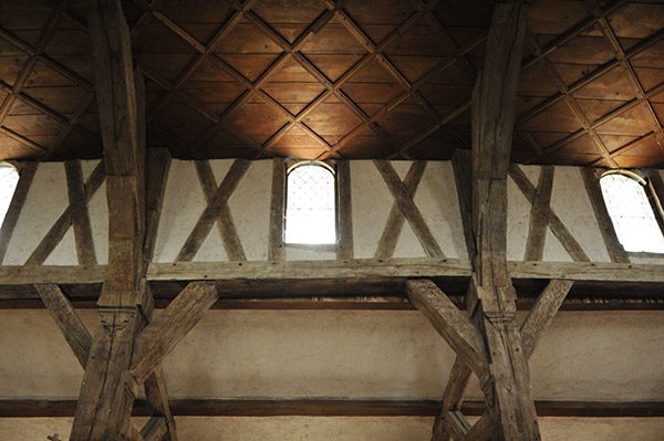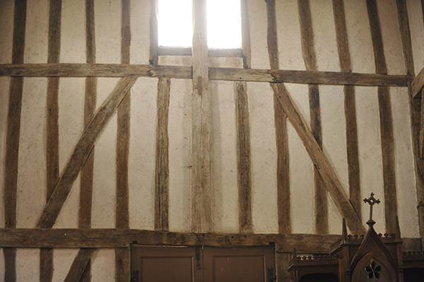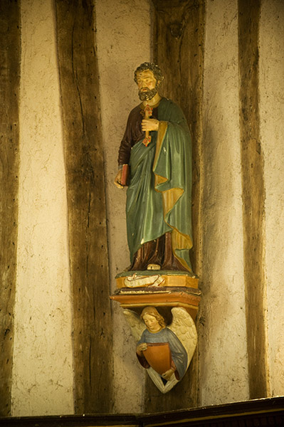 壁は白く木組みの構造がよく見えて美しい。内陣には彩色された木像が祭られている。