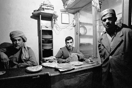 バザールの食堂 金串に日本の焼き鳥のように刺した羊肉を炭火で焼いている