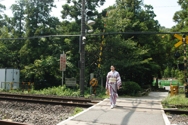 円覚寺前の踏切 今”反対の山の方”から円覚寺に向かって踏切を渡っている |